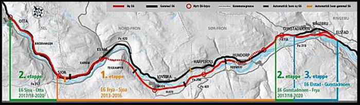 For å tilrettelegge for en mest mulig kontinuerlig utbygging vil Statens vegvesen dele strekningen E6 Elstad – Frya i to. Strekningen Gunstadmoen – Frya (ca. 4 km) bygges ut som del av utbyggingsetappe II sammen med Sjoa – Otta (ca.12 km). Det legges opp til mulig byggestart 2017/18.