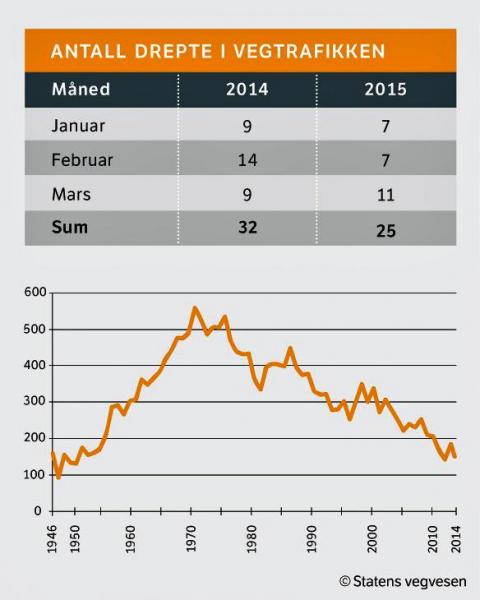 Tallene for januar og februar var rekordlave med 14, fordelt på sju omkomne på hver av månedene. Selv om mars har krevd 11 menneskeliv i ni dødsulykker, er 25 trolig det laveste kvartalstallet noensinne.