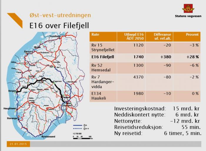 – Det er nå behov for å plukke ut noen få hovedforbindelser for å sikre at det blir nødvendige midler til større utbygginger av disse. E134 over Haukeli og riksveg 7/52/E16 over Hemsedal bør prioriteres når forbindelsene mellom øst og vest skal utbedres, sier fungerende vegdirektør Lars Aksnes.