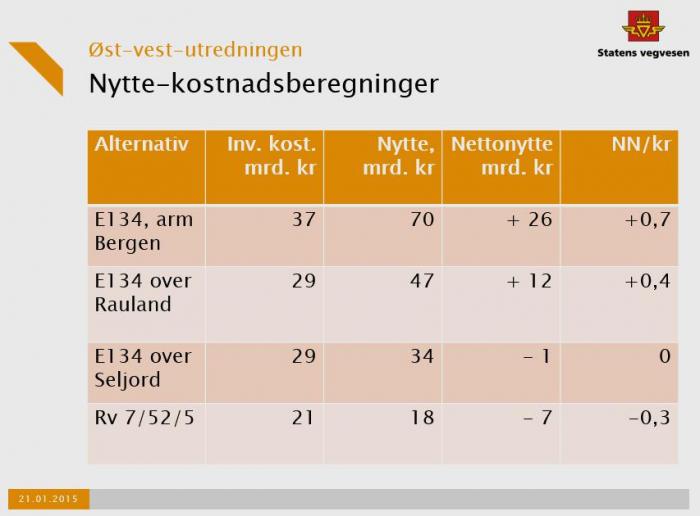En utbygging av forbindelse fra E134 mot Bergen fra Jøsendal via Odda gir en rask rute mellom Bergen og Oslo og god samfunnsøkonomisk lønnsomhet.