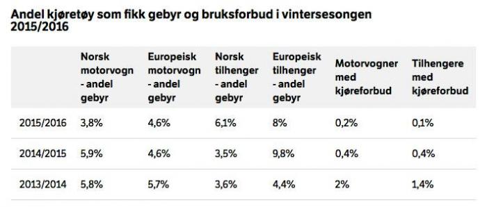 Tallene er svært positive. Vi kan blant annet se at antallet tyngre motorvogner som fikk kjøreforbud, er redusert fra 2 prosent i 2013/2014 til en tiendedel i 2015/2016. Tendensen er lik når det gjelder tilhengere, hvor kjøreforbud er redusert fra 1,4 prosent til 0,1 prosent over samme periode.