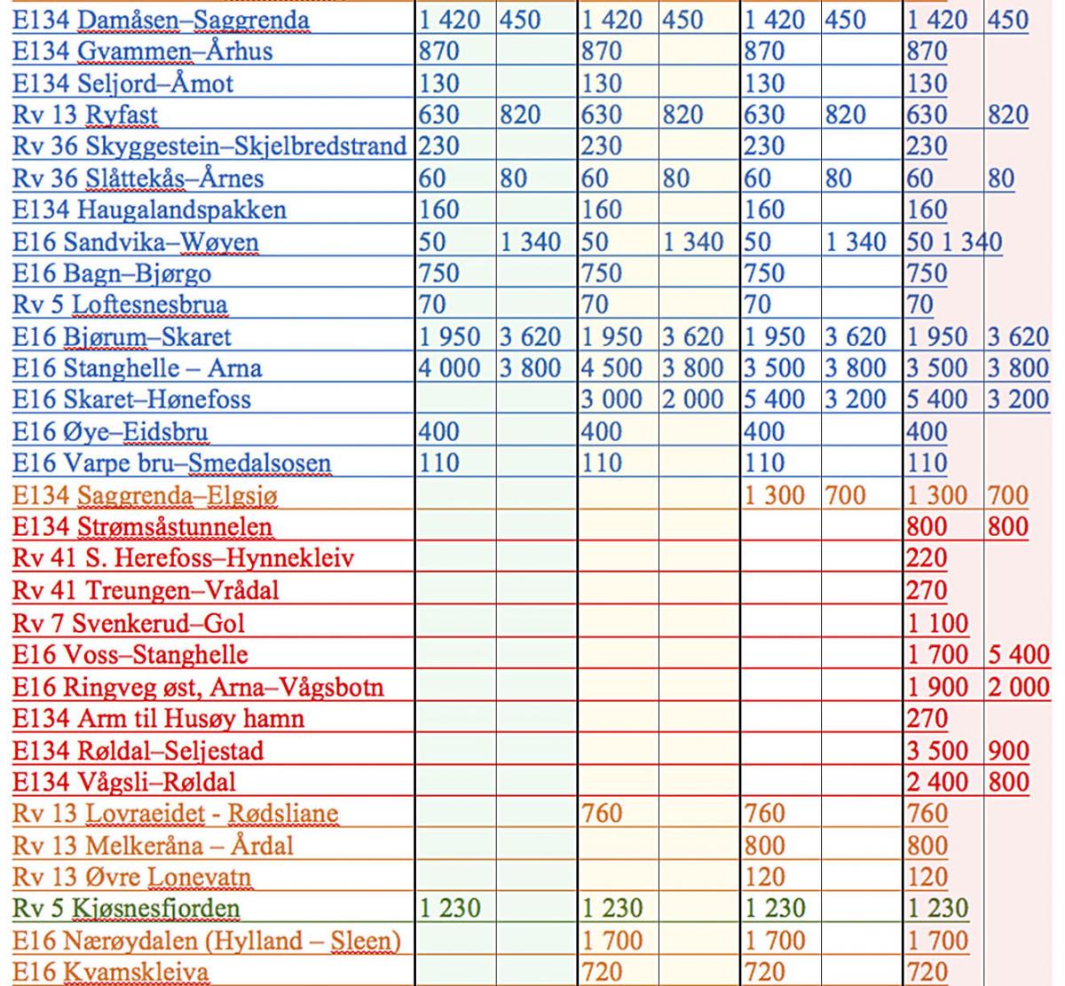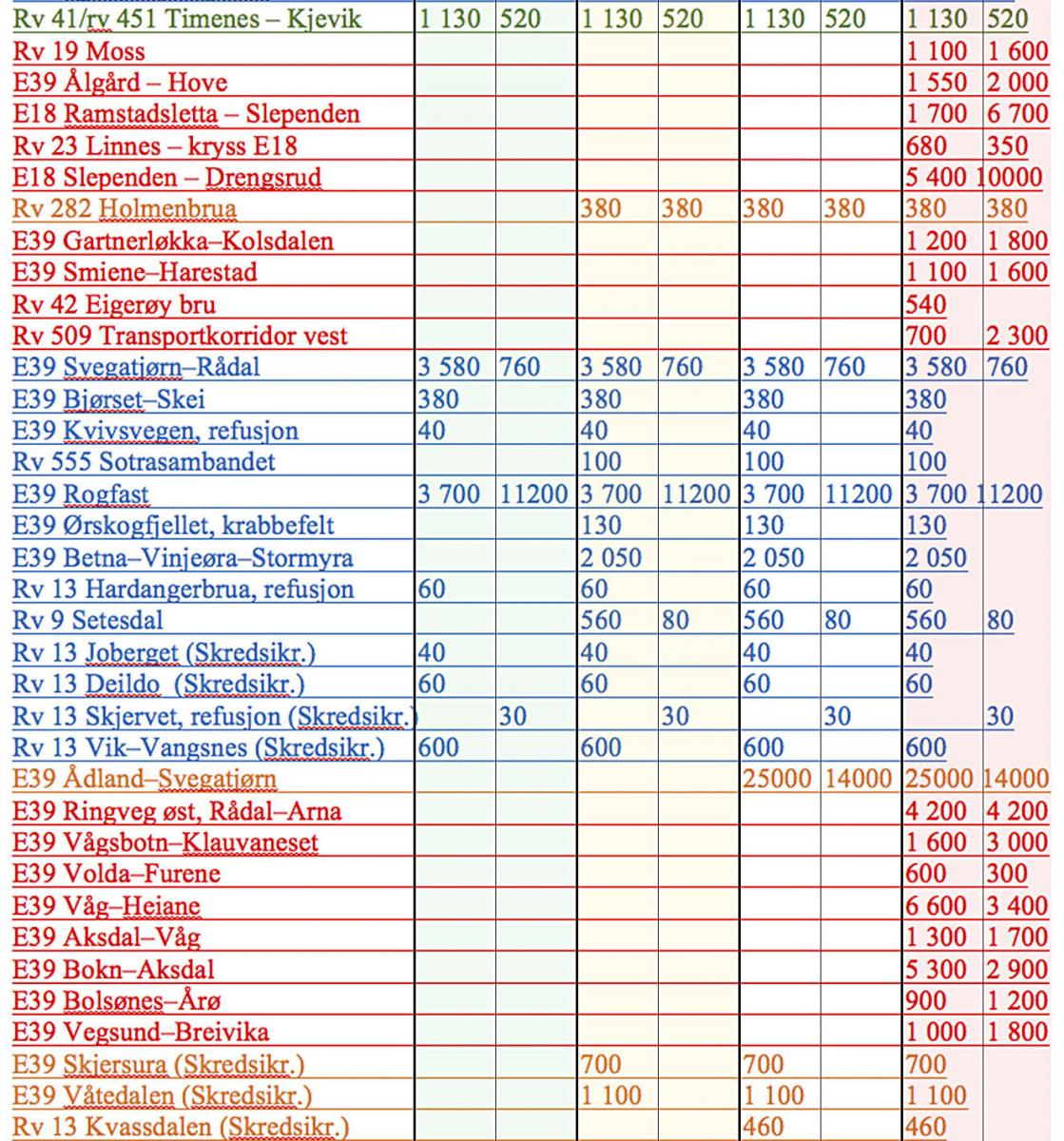 Tallene er hentet fra NTP Grunnlagsdokument, kapittel 21 - Korridorvise omtaler. Oversikten dekker hele Norge, totalt 143 vegprosjekter.