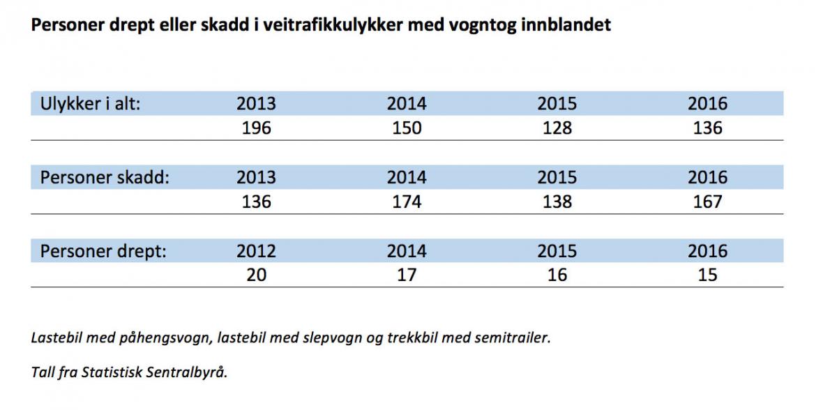 Totalt ble det registrert 136 ulykker med vogntog i 2016, med totalt 167 hardt skadde. Dette er en oppgang fra 2015, hvor tallene var henholdsvis 128 og 138. Til tross for dette har likevel antallet drepte gått ned.