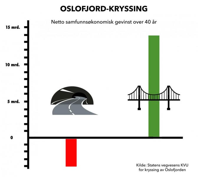 Regjeringens hovedargument for tunnel er lavere anleggskostnad og kortere byggetid. Men om tunnel er billigere, så vil løsningen ha langt høyere vedlikeholdskostnader og behov for jevnlige reinvesteringer. Den vil dessuten gi større høydeforskjeller og kjørelengde, og får en dårligere effekt på trafikkavviklingen i Oslo- og Oslofjord-området, blant annet fordi en bratt tunnel vil være lite hensiktsmessig som en del av den fremtidige Ring 4 rundt Oslo. SVVs konseptvalgutredning viser da også at bro gir en netto positiv samfunnsøkonomisk gevinst på 13,9 milliarder kroner i løpet av 40 år. Tilsvarende tall for den planlagte tunnelløsningen er minus 4,1 milliarder kroner.