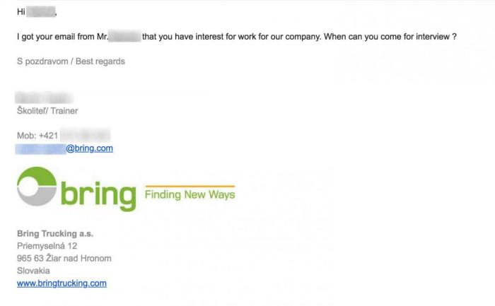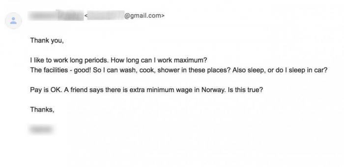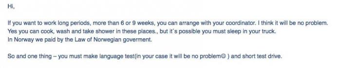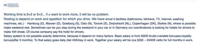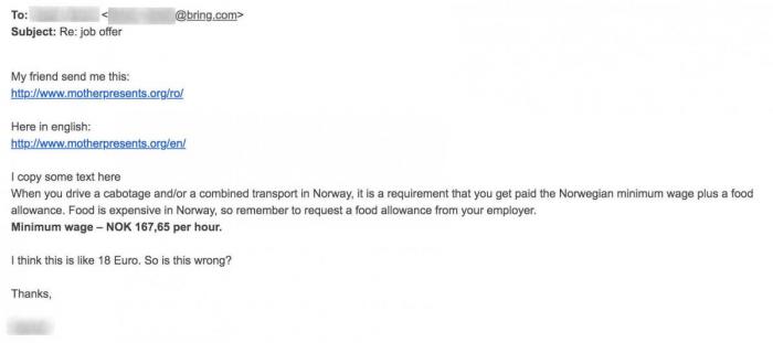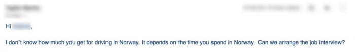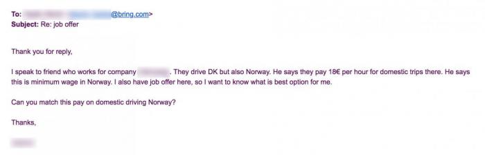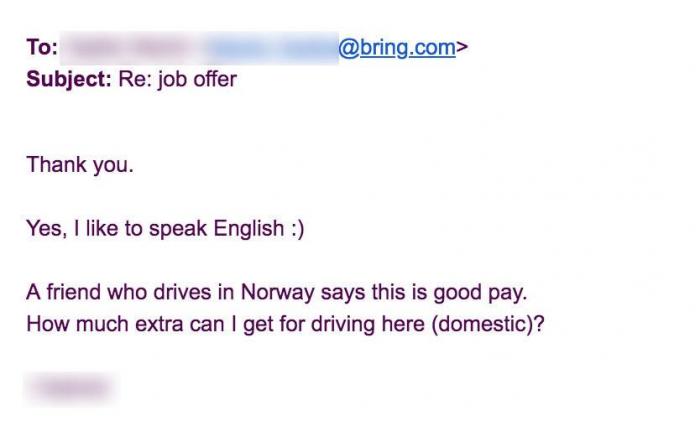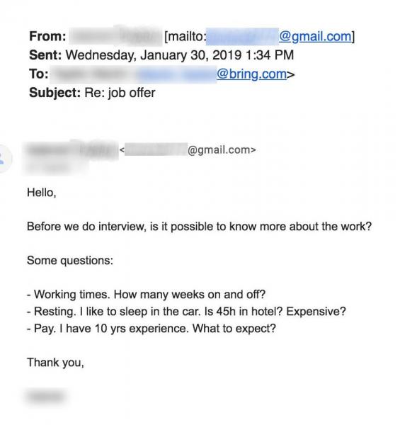 Det ble først sendt en e-post til en hovedadresse med en generell jobbhenvendelse, hvor sjåføren beskriver seg selv som 35 år gammel og har 10 års erfaring med kjøring over hele Europa. Han ytrer et ønske om kjøring spesifikt i Skandinavia.