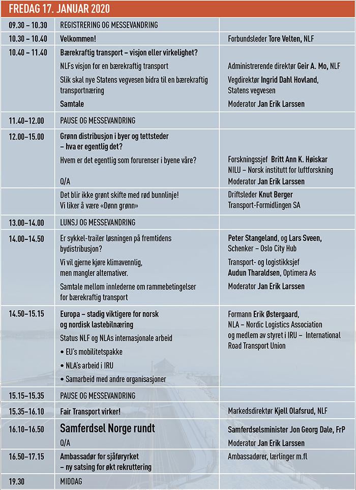 På toppen av dette vil deltakerne få spennende og høyaktuelle innlegg om transportkriminalitet, prosessen rundt EUs mobilitetspakke, muligheter og utfordringer ved fremtidens strengere miljøkrav, samt arbeidet med Fair Transport-sertifisering i NLF-bedriftene.