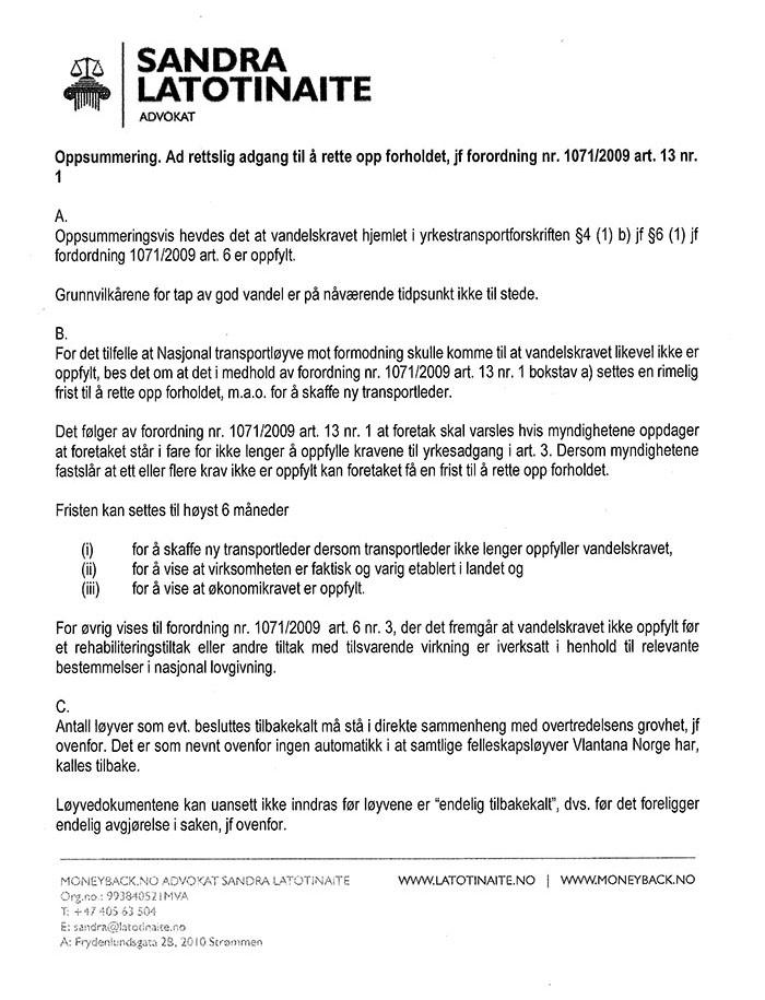 Lastebil.no har fått innsyn i brevet som ble sendt av advokat Sandra Latotinaite på vegne av Vlantana Norge. De inneholder en rekke juridiske tolkninger som Vegvesenet måtte forholde seg til før de fattet sitt endelige vedtak om tilbakekall av løyvene. I tillegg ble det varslet både gyldighets- og erstatningssøksmål, med bakgrunn i at vedtaket om tilbakekall av løyver vil «innebære en betydelig materiell skade for Vlantana Norge».