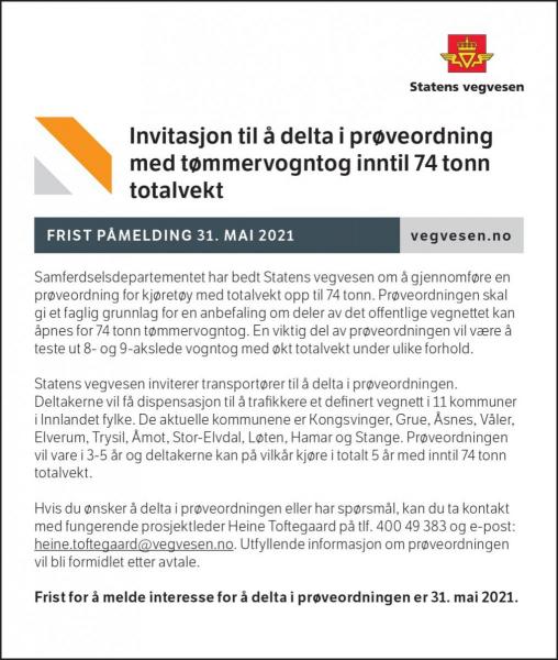 Prøveordningen skal gi Statens vegvesen et faglig grunnlag for en anbefaling om deler av det offentlige vegnettet, på sikt, kan åpnes for 74 tonn tømmervogntog. Det er Samferdselsdepartementet som har bedt Statens vegvesen om å gjennomføre prøveordningen. Målet er økt konkurransekraft og reduserte klimagassutslipp.