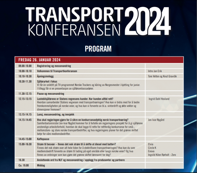 Den 26.–27. januar braker det løs med en ny transportkonferanse, denne gangen på Quality Airport Hotel Gardermoen. Vi har gleden av å informere om at NLFs nye administrerende direktør, Knut Gravråk, vil åpne konferansen sammen med forbundsleder Tore Velten. Både vegdirektøren og samferdselsministeren vil delta, sammen med en rekke andre aktuelle gjester.