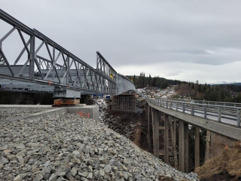 Statens vegvesen bygger en midlertidig bru ved siden av den gamle brua, som E6-trafikken skal flyttes over på. Ferdigstillelsen er forsinket.
