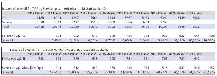 Tabell 1 og 2: Den øverste tabellen viser andel elever som går over til VG2 Transport og logistikk (VG2 TL) fra TIFF og Service og samferdsel. Etter 2019 ser vi et tydelig dropp som følge av at de mistet all rekruttering fra service og samferdsel. Tabell to, viser at det er et lite dropp i antall elever som søker seg fra VG2 TL og over til VG3 yrkessjåførfaget.