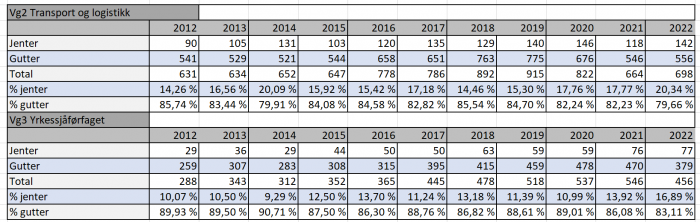 Årets søkermasse til transport og logistikkyrket viser at disse studieretningene klarer å holde hodet over vann, på tross av endringer i skolereformen som kom i 2019. Disse endringene førte til at det ble færre søkere til transport- og logistikkfagene ved at de mistet all rekruttering fra service og samferdsel (dette vises også tydelig i tabell 1 og 2).