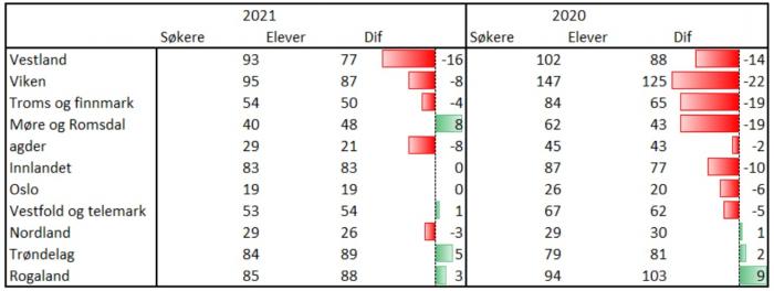 Kilde: Alle tall er hentet fra Utdanningsdirektoratet, men tabellene er utarbeidet av NLF-internt.