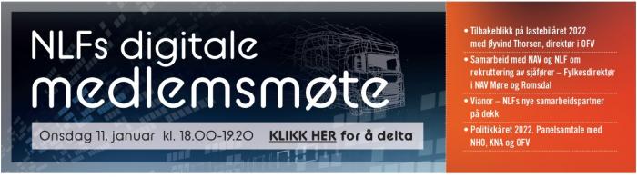 Aller først ønsker vi å minne alle på om at det i dag, onsdag 11. januar, er klart for årets første digitalt medlemsmøte fra studio i St. Olavsgate i Oslo. Videre ønsker vi å informere om at NLF har fått seg ny samarbeidspartner på dekk. Kontrakten ble underskrevet på mandag. Vi minner også alle som ikke har meldt seg på Transportkonferansen om å gjøre dette så snart som mulig.