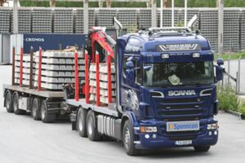 Bil og henger med 17 tm tømmerkran og tømmerstaker