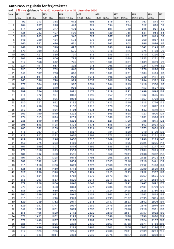 Vedlagt er AutoPASS-regulativ for ferjetakster og Riksregulativ for ferjetakster gjeldende f.o.m. 01.11. t.o.m. 31.12.2020, inkl. tilhørende pristabeller.